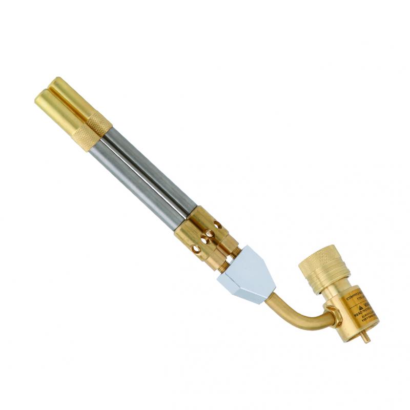 Газовая горелка  DSZH WK-1D1  с двумя соплами для пайки медных труб.  Большинство горелок DSZH наделяются зажигательным элементом(пьезой), который обеспечивает розжиг горелки одним нажатием, редуктором мощности пламени. Горелки газовые, рассчитанные под питание МАПП газом, оснащаются съёмными мини-баллонами, заправленными специальной газовой смесью, благодаря чему обеспечивается высокая рабочая температура и ровный (стабильный) выход пламени. Максимальная температура пламени  до 2400 °C, что дает возможность спаять медь, алюминий.
