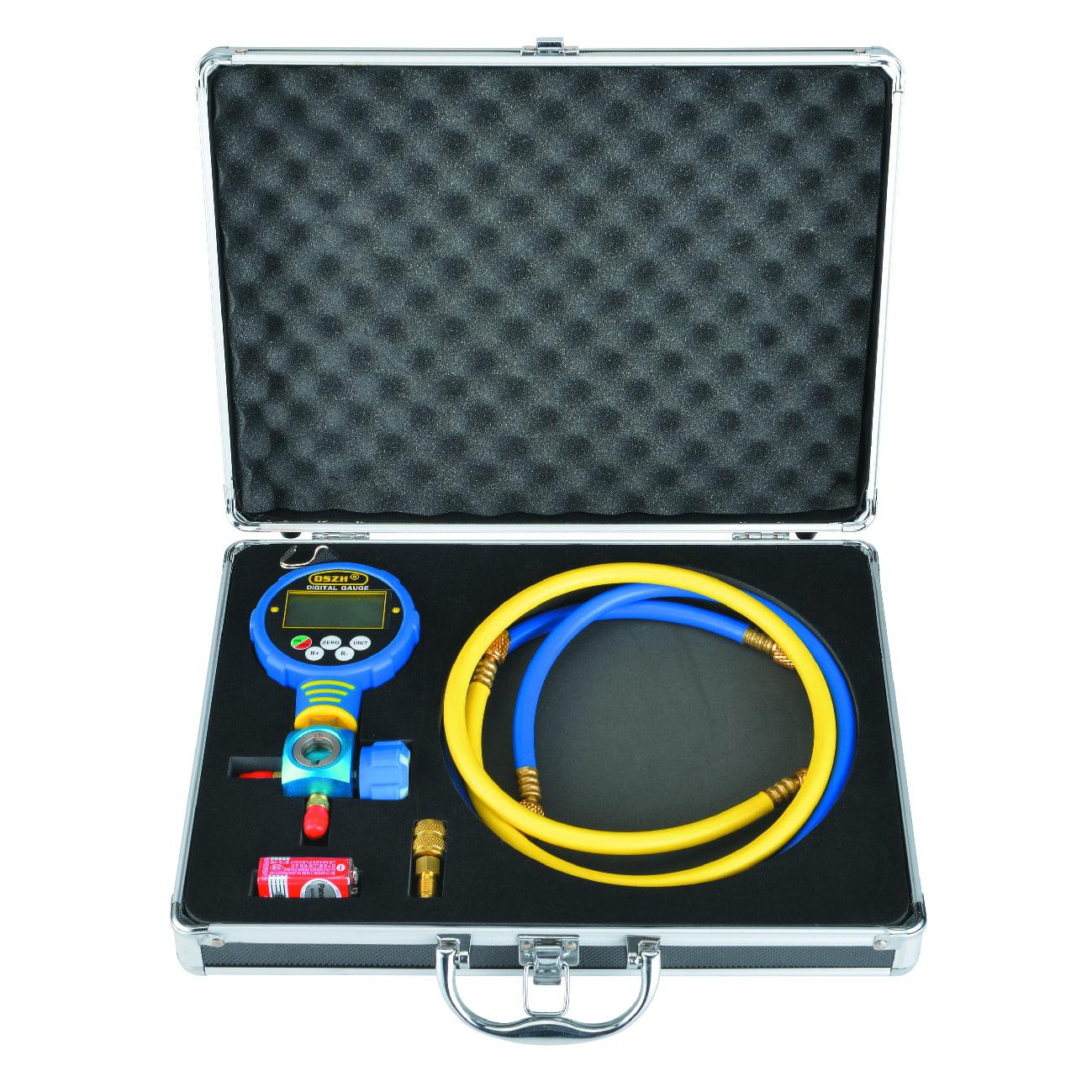 Цифровая манометрическая станция DSZH WK-6881Н представляет собой одновентильный цифровой манометрический коллектор с  комплектом из двух зарядных шлангов и смотровым стеклом, поставляется в металлическом кейсе. Цифровой мановакуумметр WK-688L/Н, они бывают синие (WK-688Н, для низкого давления) и красные (WK-688H, для высокого), отличие: синий может  и вакуум измерять и температуры кипения. В памяти у него температуры кипения по 82 хладагентам, можно изменять единицы измерения температуры (°C, °F) и давления (кПа, Бар, Psi, торр, кгс/см2, дюйм рт.ст., мм рт.ст.), можно переключать в режим вакуумметра (нажатием и удержанием клавиши "ZERO", в режиме вакуумметра не отображается хладагент и температура - только давление и показывает % от "полного" вакуума).